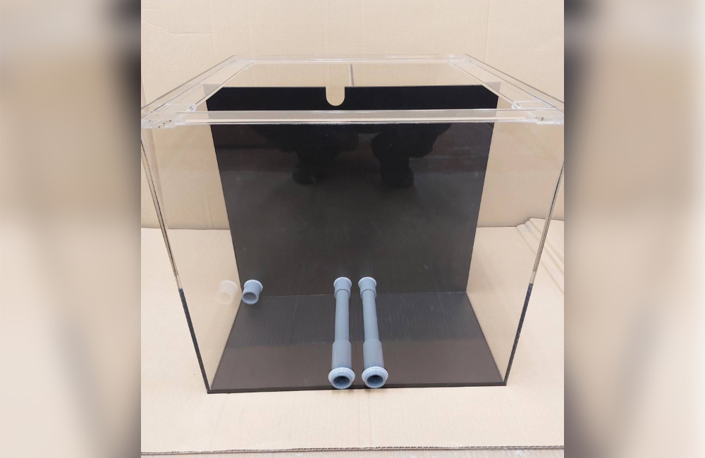 実験に必要なパーツ、機器などを内部に設置していただくことを前提に、水槽にはT字型仕切り板の接着、ソケット加工を施し、サイズに合わせたVP管もご用意しました。
